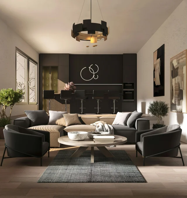 Color plays a defining role in the design — sophisticated tones layered with subtle highlights and occasional bold gestures. Natural light is used to enhance these elements, casting warmth and dimension throughout the space. This eclectic yet polished aesthetic allows the apartment to feel both energetic and serene, capturing the essence of modern sophistication.